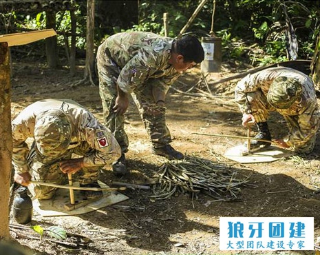 第一部分军事拓展训练主题是基本生存技能,主要内容是教授新队员如何在野外寻找食物和水源,怎样生火和建造栖身所而不被敌人发现。