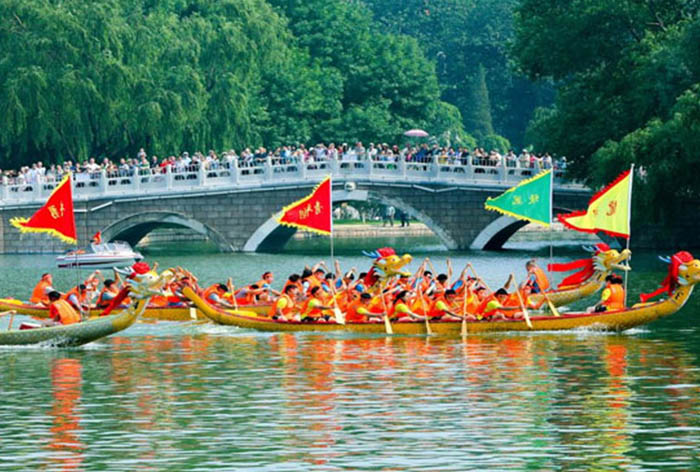 赛龙舟最早当是古越族人祭水神或龙神的一种祭祀活动,其起源有可能始于原始社会末期。赛龙舟是中国民间传统水上体育娱乐项目,已流传两千多年,多是在喜庆节日举行,是多人集体划桨竞赛。史书记载,赛龙舟是为了纪念爱国诗人屈原而兴起的。由此可见,赛龙舟不仅是一种体育娱乐活动,更体现出人们心中的爱国主义和集体主义精神。龙舟船的大小因地而异。比赛是在规定距离内,同时起航,以到达终点先后决定名次。我国各族的龙舟赛略有不同。汉族多在每年“端午节”举行,船长一般为20—30米,每艘船上约30名水手。